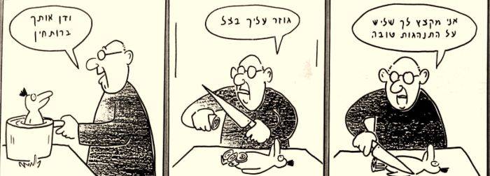 בשלב הזה, אחרי שגמרנו את המנות הראשונות, ביקש גבע מהברווז לקפוץ למטבח, כי יש לו שם שיחה דחופה מעורך־הדין שלו. ניצלתי את האתנחתא כדי לברר עם גבע על קשיי העבודה עם הברווז. איך למשל, שאלתי אותו, אתם מבצעים את הבדיחות עם הקצב? זה לא מסובך לאלף ברווז לשבת מתחת לקופיץ־קצבים?