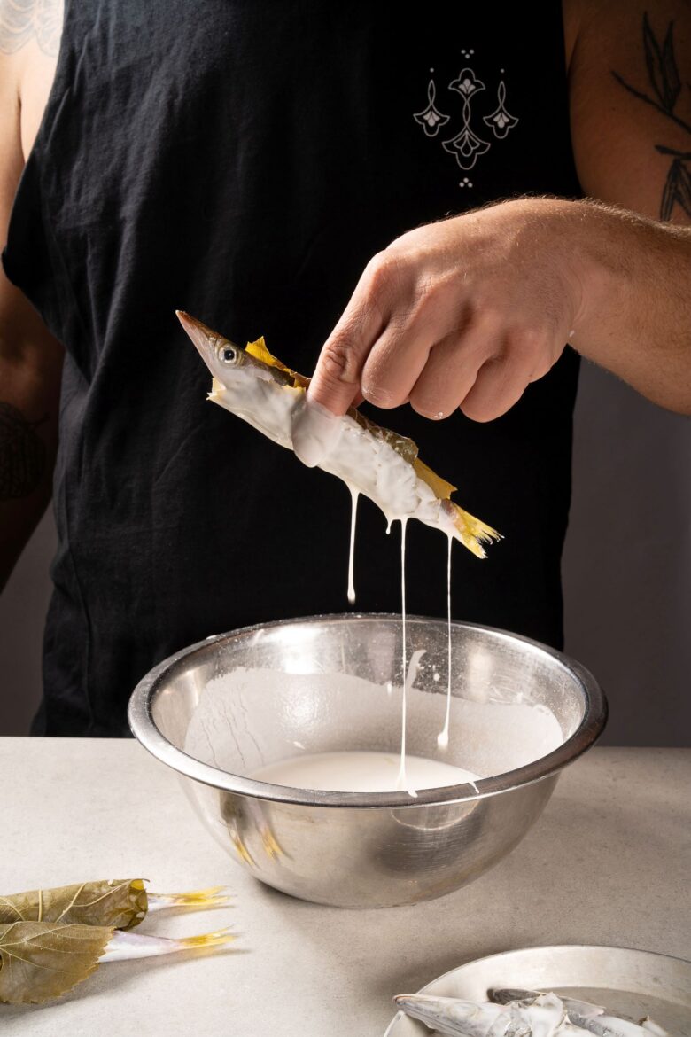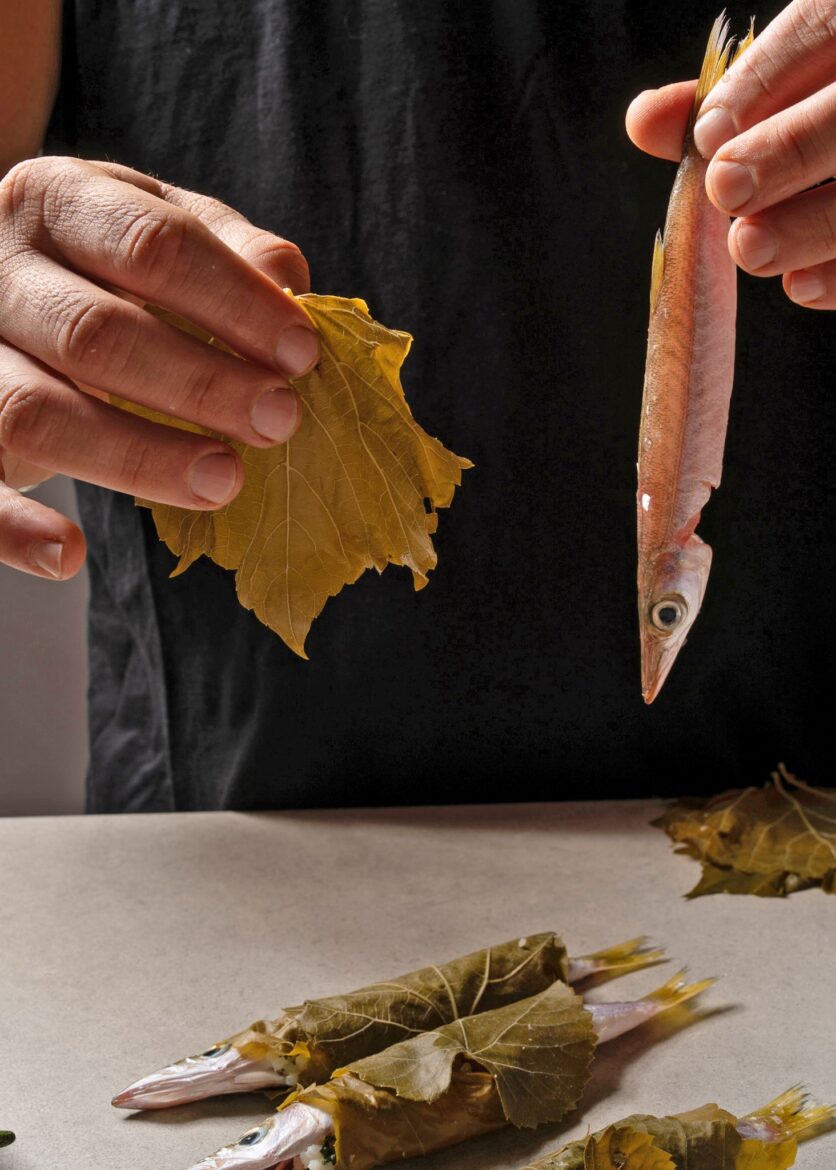 כשישבנו לאכול את הדג, חשבתי על איך הטעמים הפשוטים והמוקפדים האלה מזכירים לי את המנות שאני אוהב להכין בבית. פתאום עלתה לי בראש המנה הזו: דג מליטה קטן ופשוט ממולא באורז מתובל, עטוף בעלה גפן ומטוגן בטמפורה יפנית קלילה.
