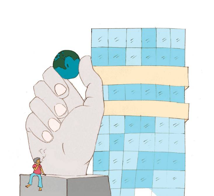 אפרופו גינה: בכל הבתים שבהם התגוררתי מאז שעזבתי את תל אביב, החצר היתה חשובה לי יותר מהבית עצמו. בריג'נסי, כמו בכל ים המתחמים שמסביב, יש הרבה שטח פתוח אבל אין "חצר". אין צל, אין פינות ישיבה נעימות פרט לשני ספסלי–בטון סובייטיים למראה. ומעל לכל הבטוניאדה מיתמר פסל מטעם התאגיד העליון שלו שייך כל אזור התעשייה, ולו שייכת גם קיסריה כולה (כי כן, קיסריה היא לא רשות עירונית רגילה, אין בה מועצה נבחרת אלא מועצת מנהלים): קרן רוטשילד. ואני יודע שקוראים רבים שלנו צוהלים עכשיו בקריאות "ידעתי שבראשית הם עיתון ממסדי שתול! הם שייכים לקרן רוטשילד!" אבל אני מבקש מכם לא להתפזר ולהישאר איתי לרגע של התפעלות מהפסל של קרן רוטשילד הכל–יכולה: יד ענקית אוחזת בכדור הארץ כאילו הוא גולה פיצית, צעצוע קטן וחמוד. אני לא יודע מה יותר מבעית בפסל הזה – האמירה הגלובליסטית הפוגענית והאלימה, או כמה שהדבר הזה פשוט מכוער. זה נראה כמו פרודיה של אקטיביסטים צעירים ולא מאוד מוכשרים, אבל זה אמיתי לגמרי.