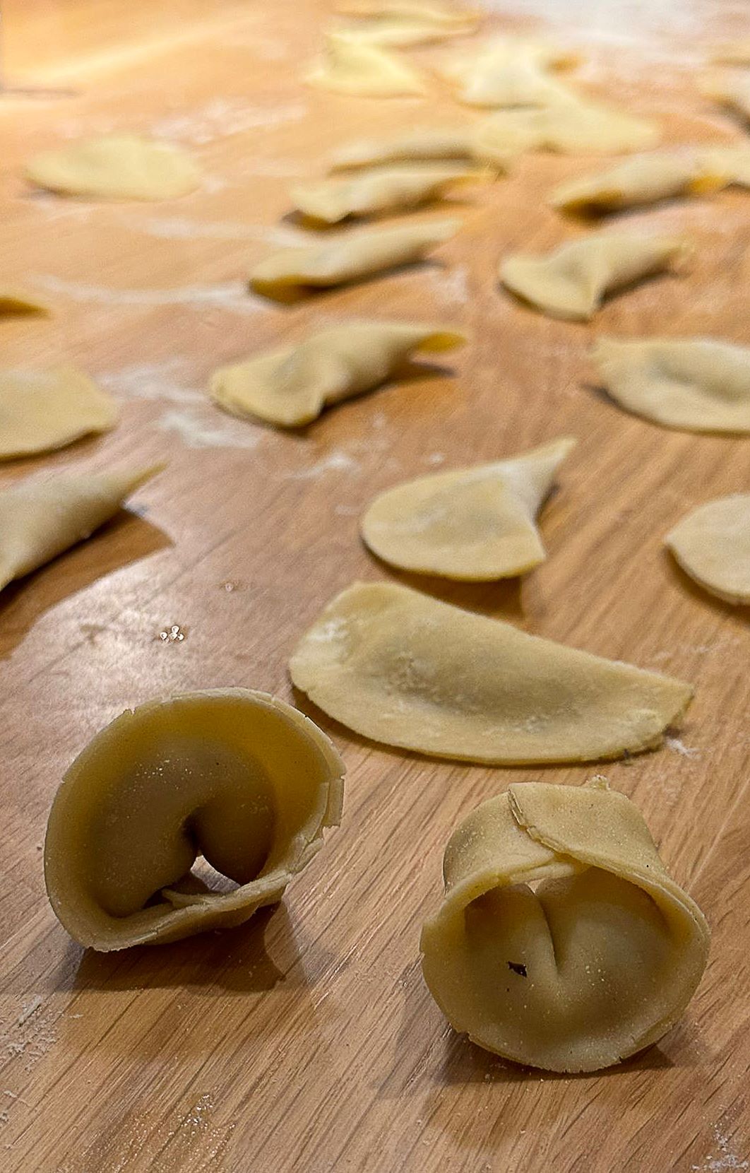 בעזרת כפית מניחים מלית באמצע כל עיגול, מרטיבים עם האצבע את קצותיהם, מקפלים לחצאי ירח ומהדקים את הקצוות. למי שחובב טורטליני – ניתן ללפף את חצאי הירח הממולאים סביב האצבע ולהדק את קצותיהם בצורת שבלול.