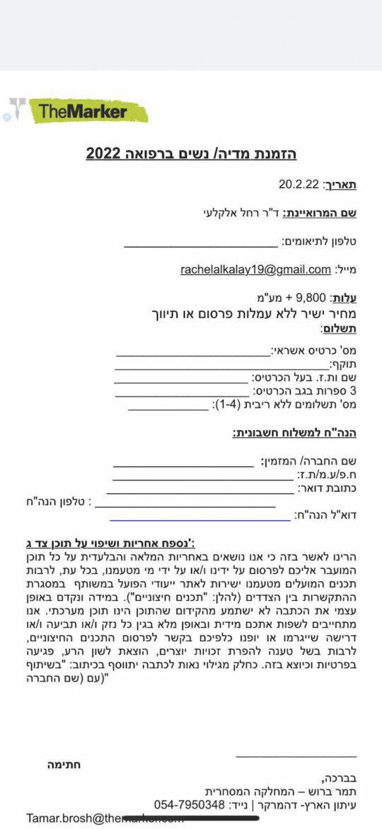 לרגל יום האישה הבינלאומי שחל ב-8 במרץ 2022, הופק בעיתון הארץ מוסף שיווקי רפואי. "ראיתי בכך הזדמנות מצוינת לפרסם את הסיפור שלנו כי עד היום חוץ מהג'רוזלם פוסט בעצם לא קיבלנו שום חשיפה לתרופה שלנו", מספרת עורכת דין רחל אלקלעי, בעלת חברה בתחום הביוטק. היא פנתה למחלקת השיווק של הארץ וסגרה איתם על פרסום כתבה שיווקית במוסף הכתוב ובאתר של העיתון, תמורת 10,000 שקל. אלא שממש לפני צאת הגיליון, אחרי שהכתבה כבר היתה מוכנה ומעומדת גרפית, המחלקה המשפטית של העיתון החליטה לפתע לגנוז אותה. בהתחשב בכך שמדובר בכתבה פרסומית שמכניסה לקופת הארץ אלפי שקלים, זו היתה בהחלט תפנית מפתיעה בעלילה. לדברי אלקלעי, ההסבר של מחלקת השיווק על הגניזה הבלתי צפויה היה ש"מצטערים, אך לא ניתן לפרסם כתבה על תרופה שעדיין נמצאת בהליכי מחקר". אלקלעי לא השתכנעה מהתשובה. "ראיתי באותו מוסף כתבות אחרות על תרופות שמצויות בתהליכי מחקר אבל משום מה…