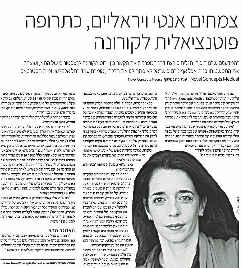 אני שואל אותה האם פנתה גם למח"צ (מועצת החירום הציבורית). "כן, הם קיבלו מאיתנו הודעות, כולל פרופ' אהרון צ'חנובר, חתן פרס נובל. אמרנו לו שיש לנו תרופה טבעית. הוא אמר 'מעניין מאוד אבל אני לא עוסק בחקר הקורונה' ".