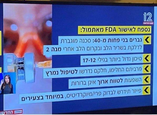 בשבוע שעבר התגלו גם סימני חיים ראשונים במהדורת חדשות 12, שבירה של קשר השתיקה מאולפן -לאולפן בנושא תופעות הלוואי של תכשיר פייזר. לאחר שה-FDA נאלץ להוציא נספח לאישור החיסון (בעקבות תביעה לחופש המידע שביטלה חיסיון על מסמכי פייזר), דווח פורסם במהדורת החדשות על קצה הקרחון על: סכנה מוגברת לדלקת שריר הלב ובקרום הלב לאחר מנת החיסון השנייה; סיכון גדול יותר בגיל 12-17; ודאגה עמוקה בקשר למיקרודיטיס במיוחד בקרב צעירים. יצויין כי הדו"ח של פייזר עצמה, כפי שפרסמנו כאן בעבר, כולל 1,251 תופעות לוואי שונות.