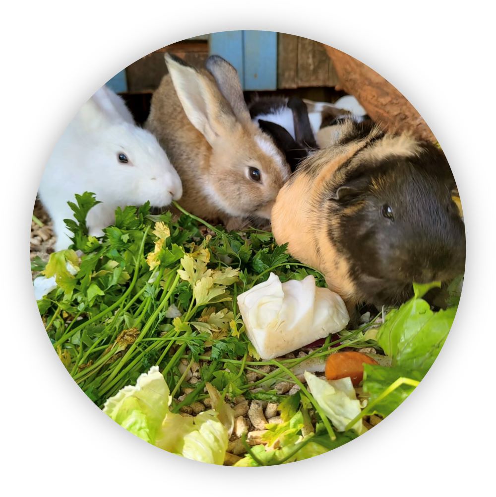 אחריהם אנחנו מורידים עוד ועוד כלובים בהם המוני ארנבונים וחזירוני ים שעוברים מיד לכלוב טיפולי מרופד בחציר יבש וחמים עם עלי חסה וכרוב.